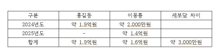 ⓑ 이몽룡씨는 2025년 1월에 법인전환을 하면서 영업권 평가액 10억원을 양수도했고, 2025년도에는 무보수로 하였다. 2024년도 개인사업자에서 발생한 사업소득은 홍길동씨와 동일하게 1억원이라고 가정해보겠다. |