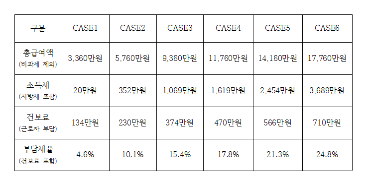 각 케이스별 세부담액을 보면 적지 않은 세금을 낸다고 생각할 수도 있지만, 부담세율에 주목해 볼 필요가 있다. 부담세율을 보면, 월 1,000만원까지는 부담세율이 20%가 되지 않고, 월 1,500만원인 경우에도 20%대의 부담세율을 형성하고 있는 것을 확인할 수 있다. 만약, 공제대상인 부양가족이 있거나 대학생 자녀에 대한 교육비 세액공제, 그리고 기부금 세액공제와 연금계좌 세액공제 등을 추가로 받으실 수 있다면, 근로소득에 대한 부담세율을 더욱 낮출 수도 있겠다.